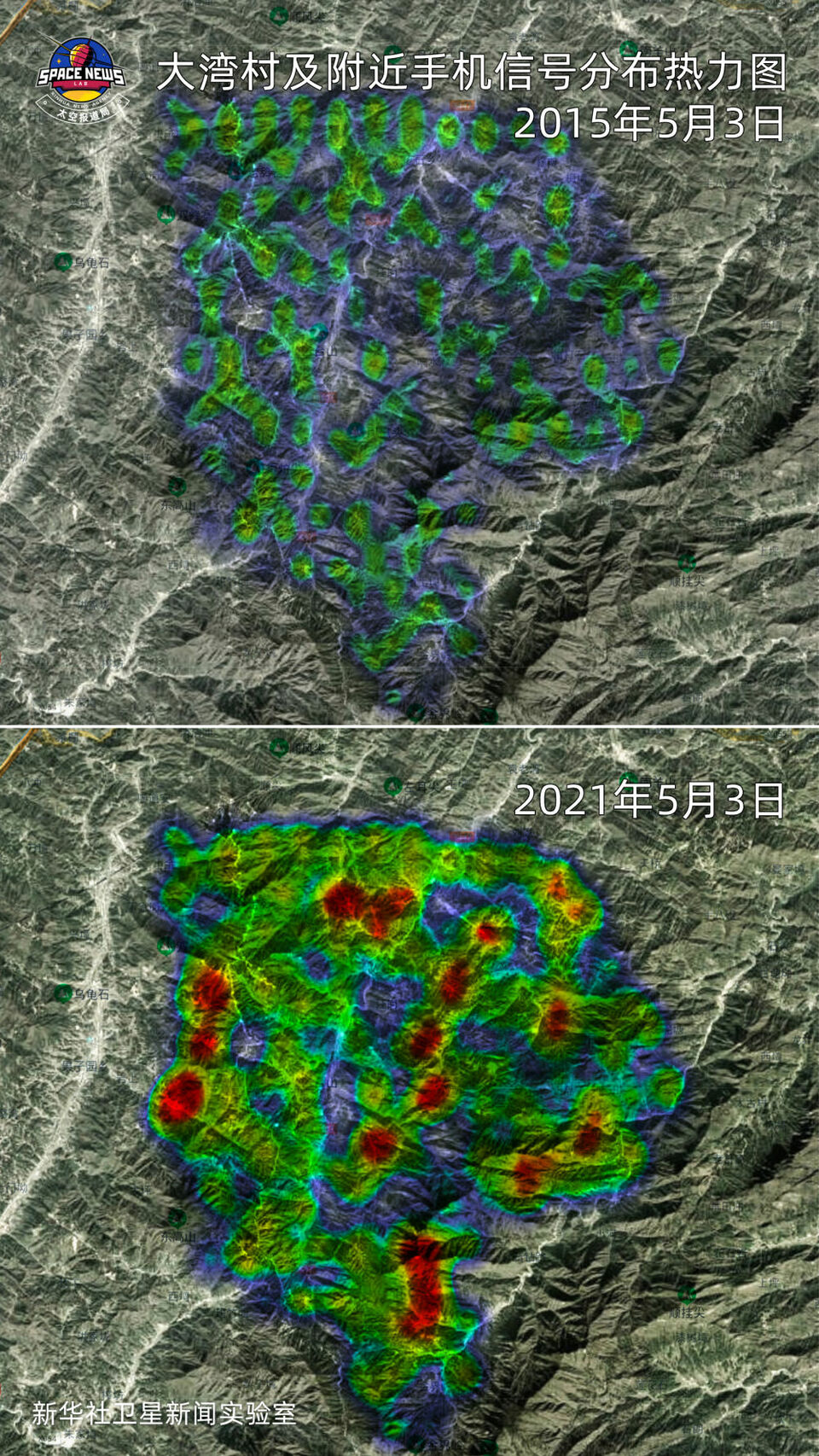 有色區域代表手機信號,信號密度越大,顏色越深。與2015年相比,更大范圍、更密集的手機信號,反映出大別山區大幅增長的人流量。