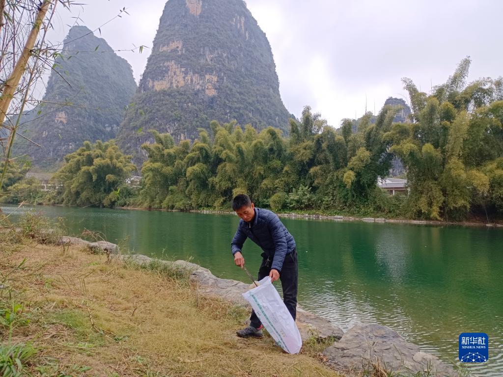 在廣西陽朔縣雞窩渡村,河長徐文通在遇龍河畔撿拾垃圾(12月29日攝)。新華社發