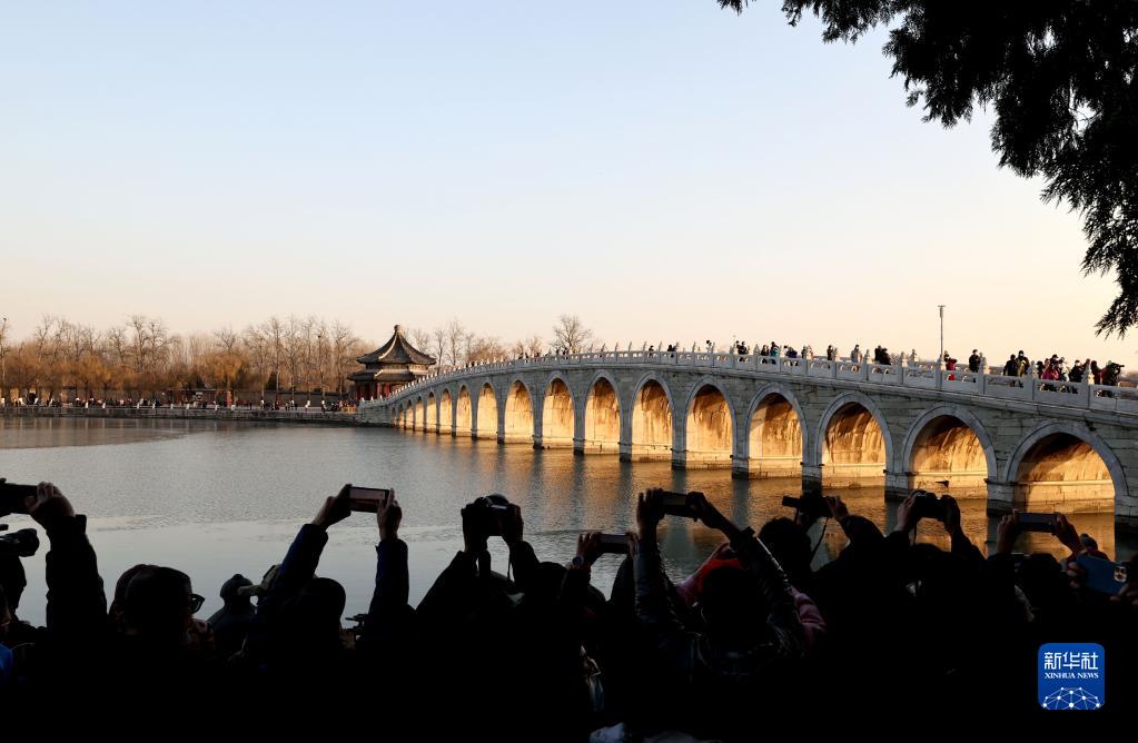 游客在北京頤和園南湖島拍攝“金光穿洞”(11月25日攝)。新華社記者 陳建力 攝