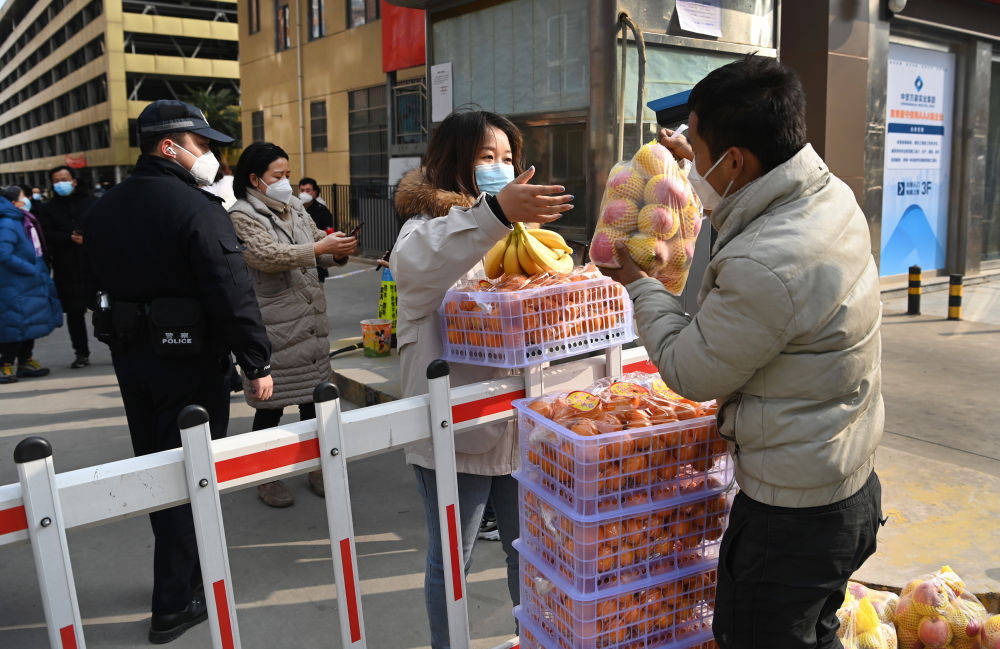 1月10日,雁塔區科技路一小區的工作人員在為居民配送愛心人士捐贈的蔬菜。新華社記者 陶明 攝