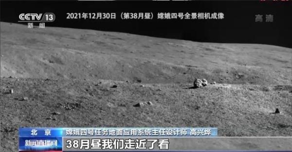 嫦娥四號任務地面應用系統(tǒng)主任設計師 高興燁:38月晝我們走近了看,這個不是一個小房子,實際上是一個石塊。我們發(fā)現(xiàn)石塊的寬度大概是20公分,高度大概是10公分,背后有一個比較大的撞擊坑,這個撞擊坑的直徑大概是22米。