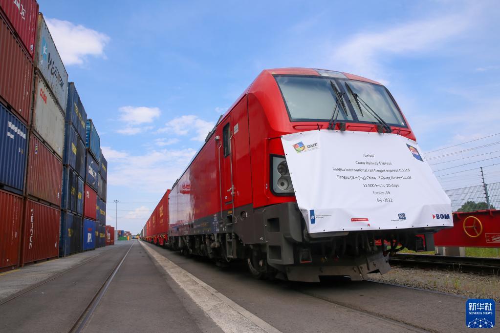 這是2021年6月4日,首趟從中國江蘇南京至荷蘭蒂爾堡的中歐班列抵達(dá)荷蘭蒂爾堡。新華社記者 鄭煥松 攝