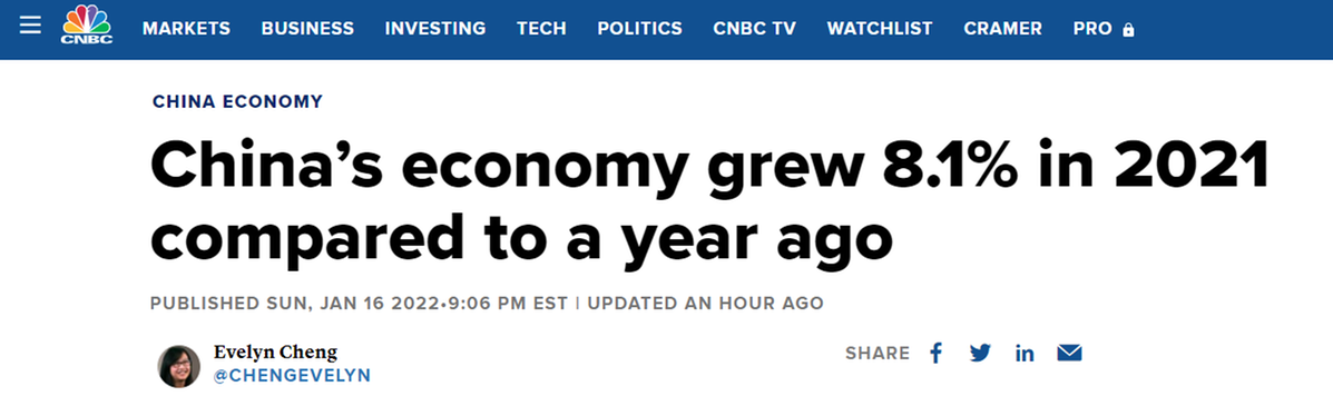 美國CNBC網站1月17日報道稱,中國國家統計局發布的數據顯示,初步核算,2021全年國內生產總值1143670億元,按不變價格計算,比上年增長8.1%。