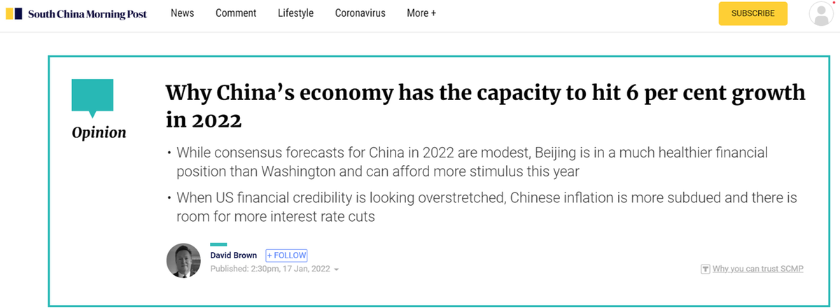 香港《南華早報》評論認為,中國的金融狀況要比美國健康得多,政策空間很大。中國經濟有能力在 2022 年實現 6% 的增長。