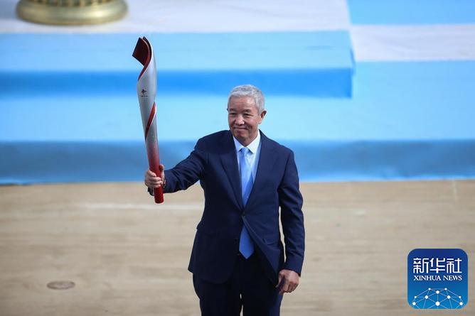 2021年10月19日,北京冬奧會火種在希臘首都雅典的帕納辛奈科體育場,由希臘奧委會交接給北京冬奧組委。北京冬奧組委特別代表、北京冬奧組委副主席于再清在交接儀式上展示北京冬奧會火炬。新華社記者鄭煥松攝