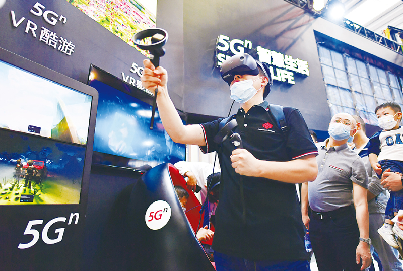 產(chǎn)業(yè)數(shù)字化和數(shù)字產(chǎn)業(yè)化是推動(dòng)數(shù)字經(jīng)濟(jì)與實(shí)體經(jīng)濟(jì)深度融合的具體表現(xiàn)。圖為2021年10月14日,參觀者在第三屆數(shù)字中國建設(shè)成果展覽會(huì)上體驗(yàn)5GnVR酷游。 中新社記者 張斌/攝