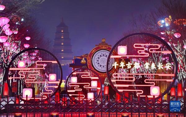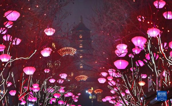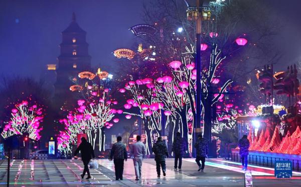 春節(jié)臨近,西安市大唐不夜城點亮璀璨奪目的燈光,迎接新春佳節(jié)的到來。
