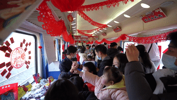 每逢年貨鋪開張,紅燈籠、中國結高掛車廂兩端,與車窗上的春聯福字相互襯托,火車內部洋溢著濃濃的年味。