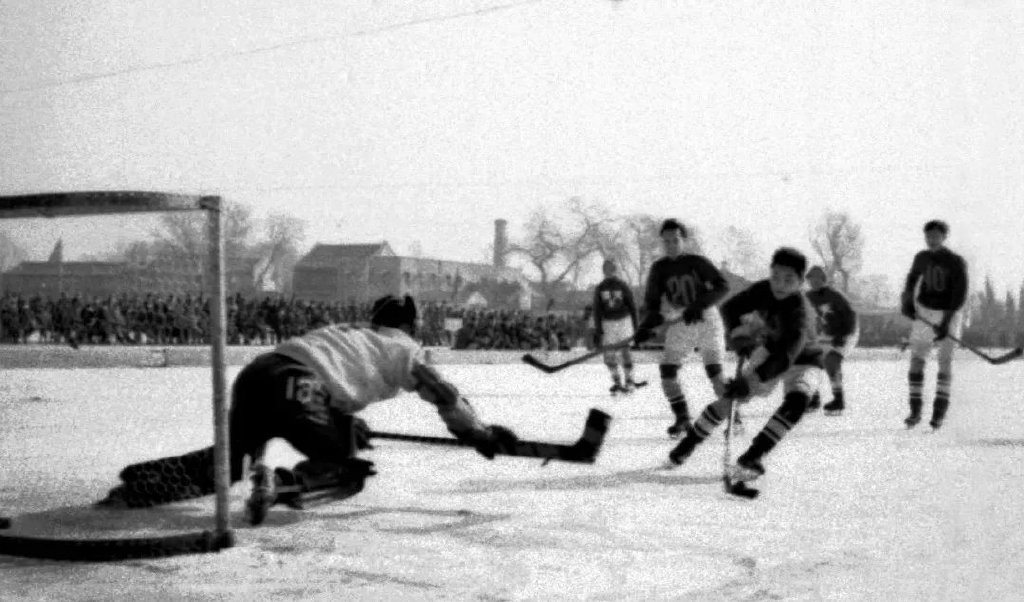 1953年,華北區冰上運動會,北京隊與天津隊的冰球比賽。(圖源:人民畫報)