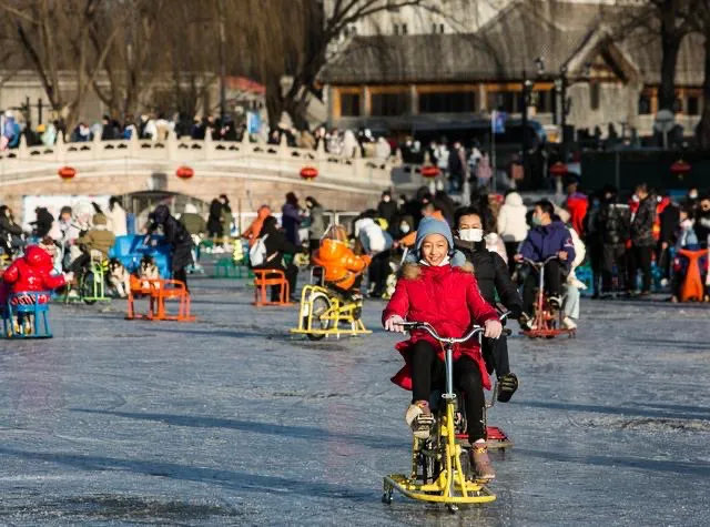 今年1月,什剎海冰場如期開放。冬日的陽光灑在冰面上。小組看到,除了滑冰,這里還有冰上自行車、冰車小海豹、冰上碰碰車等娛樂設施,儼然一個老幼皆宜的大型游樂場。