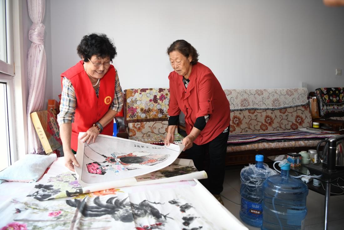 濱河社區(qū)志愿者和老人一起欣賞繪畫作品。陳琦嘉 攝
