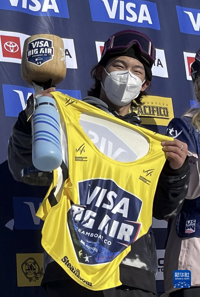 這是2021年12月4日,在2021-2022賽季單板滑雪大跳臺世界杯美國斯廷博特站男子組頒獎儀式上,中國選手蘇翊鳴慶祝奪冠。新華社發(李揚 攝)