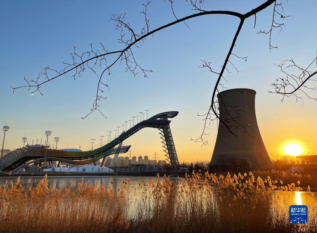 這是2021年12月28日拍攝的夕陽下的首鋼滑雪大跳臺。新華社記者 陶希夷 攝