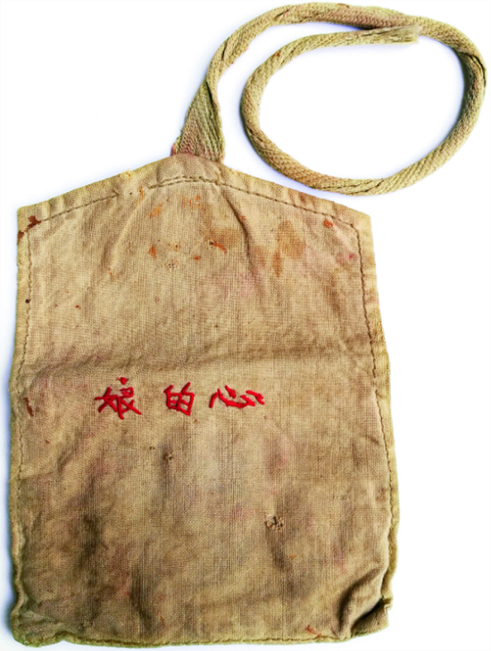 媽媽記掛遠在陜北農村吃苦的兒子,親手縫制了一個針線包,上面繡了三個紅色的字:娘的心。