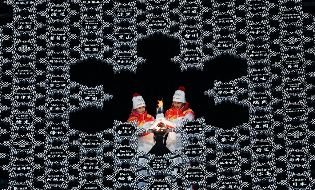 2月4日晚,第二十四屆冬季奧林匹克運動會開幕式在北京國家體育場舉行。這是最后一棒火炬手迪妮格爾·衣拉木江(左)和趙嘉文將火炬嵌入“大雪花”中央。 新華社記者 李尕 攝