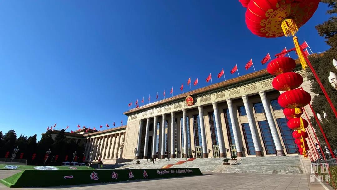 △人民大會(huì)堂外,為迎接冬奧新設(shè)計(jì)的“一起向未來(lái)”字樣格外醒目。(總臺(tái)央視記者石奇用拍攝)