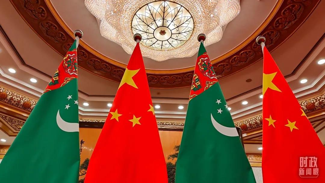 △土庫(kù)曼斯坦國(guó)旗與五星紅旗。(總臺(tái)央視記者楊立峰拍攝)