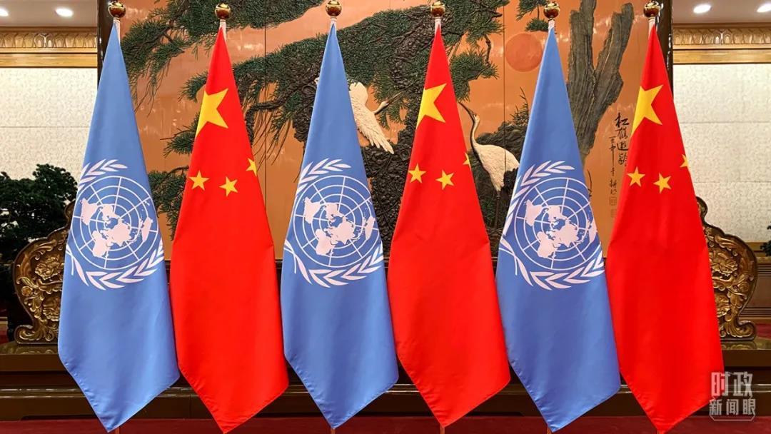 △會(huì)談現(xiàn)場(chǎng)的聯(lián)合國(guó)旗幟與五星紅旗。(總臺(tái)央視記者段德文拍攝)