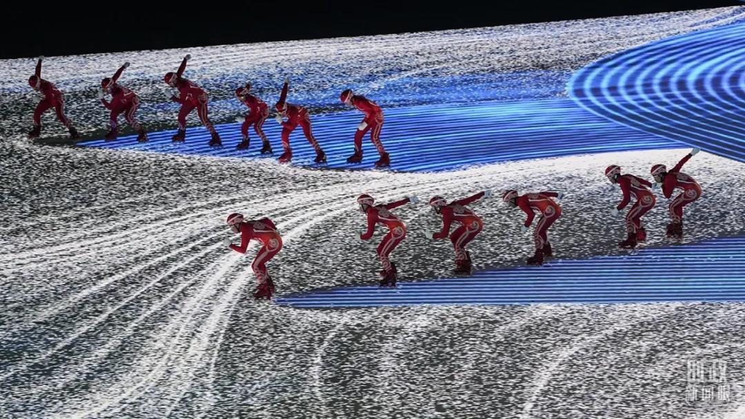 △開(kāi)幕式上,滑冰運(yùn)動(dòng)員滑過(guò)冰面后,留下長(zhǎng)長(zhǎng)的軌跡。(總臺(tái)國(guó)廣記者李晉拍攝)