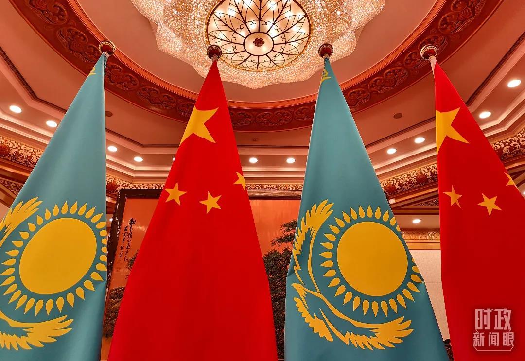 △2月5日上午,會(huì)談現(xiàn)場(chǎng)擺放的中哈兩國(guó)國(guó)旗。(總臺(tái)央視記者楊立峰拍攝)
