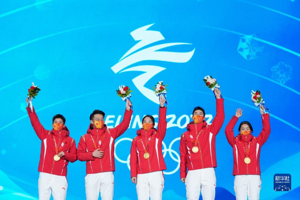 2月6日,中國隊選手范可欣、任子威、曲春雨、武大靖、張雨婷(從左至右)在獎牌頒發儀式上。