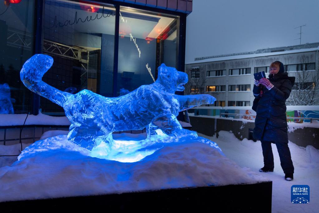 1月31日,芬蘭赫爾辛基市民為冰雕“老虎”拍照。新華社發(馬蒂·馬蒂凱寧攝)