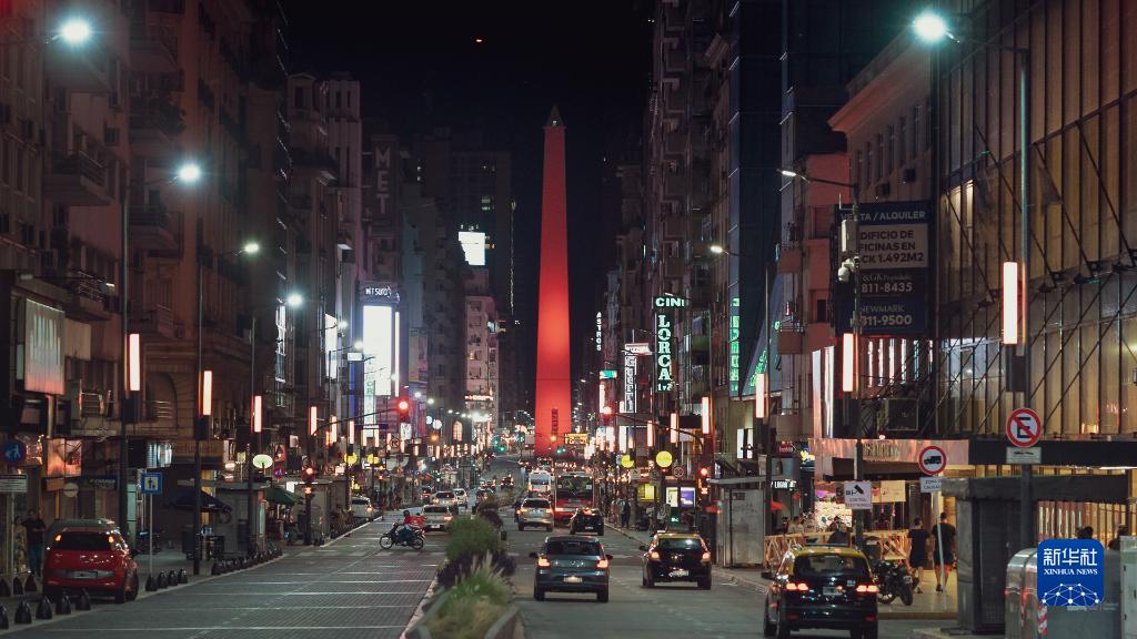 這是1月31日在阿根廷首都布宜諾斯艾利斯拍攝的亮起“中國紅”的方尖碑。新華社發(第四屆“中國春節文化之旅”主辦方供圖)