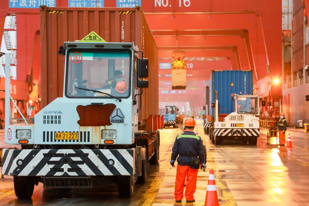 浙江寧波舟山港梅山港區橋吊在緊張作業。新華社發(楊江琦 攝)