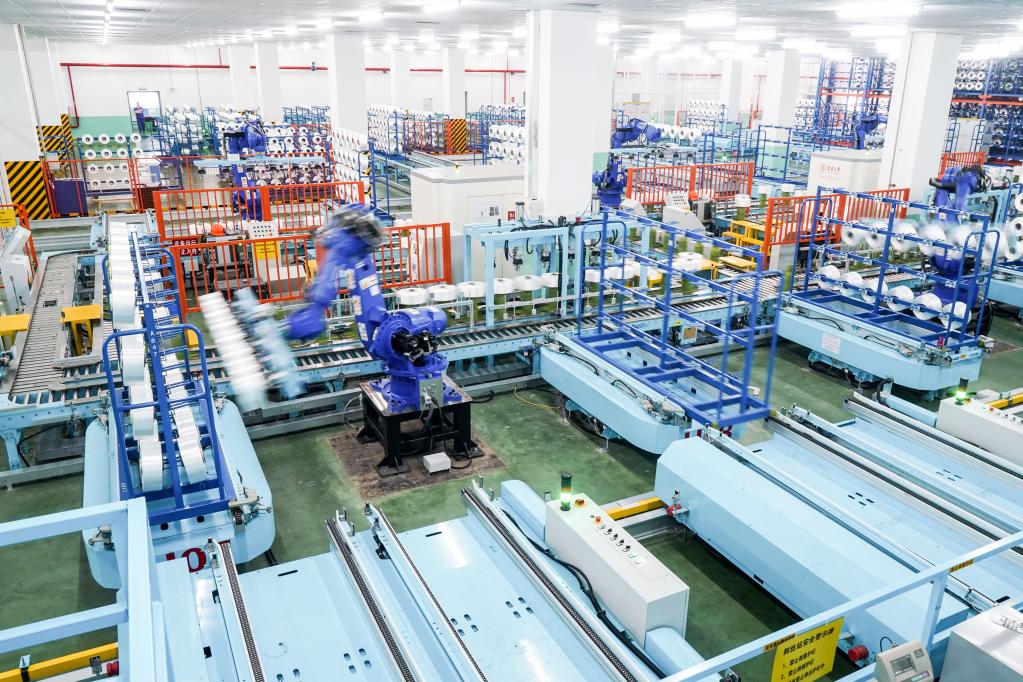 位于江蘇省蘇州市吳江區盛澤鎮的一家智能車間,機器人在車間內自動作業。新華社記者 李博 攝