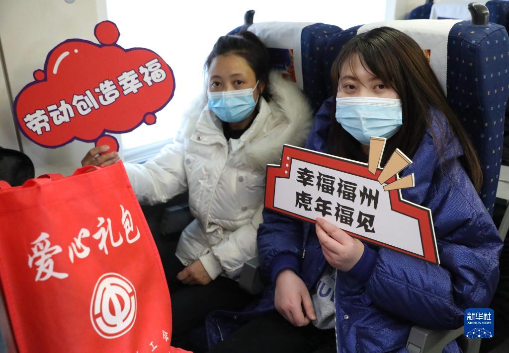 2月9日,務工人員在蘭州西開往福州的G1904次列車上。這是2022年閩隴兩省間開行的首趟務工高鐵專列,載有540名來自甘肅定西的務工人員。