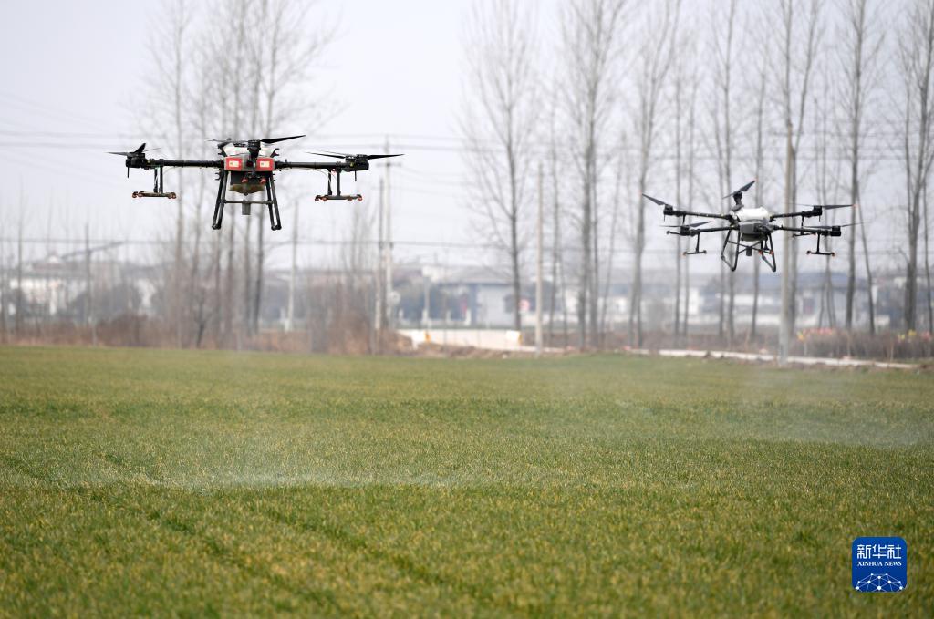 2月11日,無人機在安徽省亳州市趙橋鄉“無人農場”噴灑除草劑。