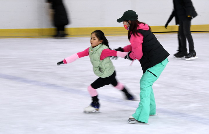 2月9日,一名兒童在朝陽大悅城的冰雪運動館體驗和學習滑冰。新華社記者李欣攝