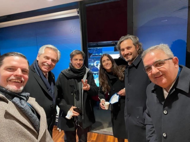 2月4日晚,阿根廷駐華大使牛望道與阿根廷總統費爾南德斯(左二)一行在北京冬奧會開幕式自拍。圖片由阿根廷駐華大使館提供