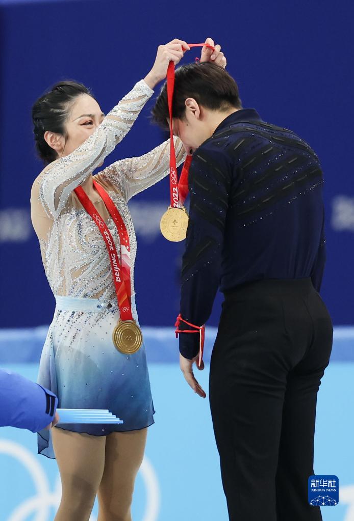 2月19日,中國選手隋文靜(左)在獎牌頒發儀式上為隊友韓聰戴上金牌。
