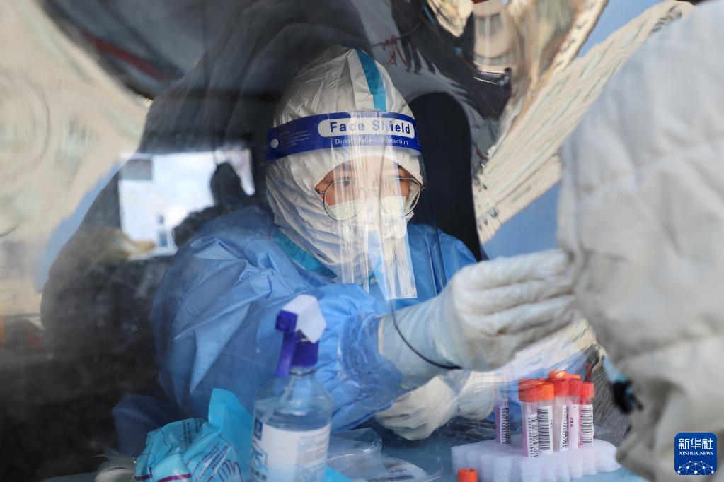 1月27日,在黑龍江綏芬河市一處核酸采集點,醫護人員對居民進行核酸采樣。新華社記者 徐凱鑫 攝