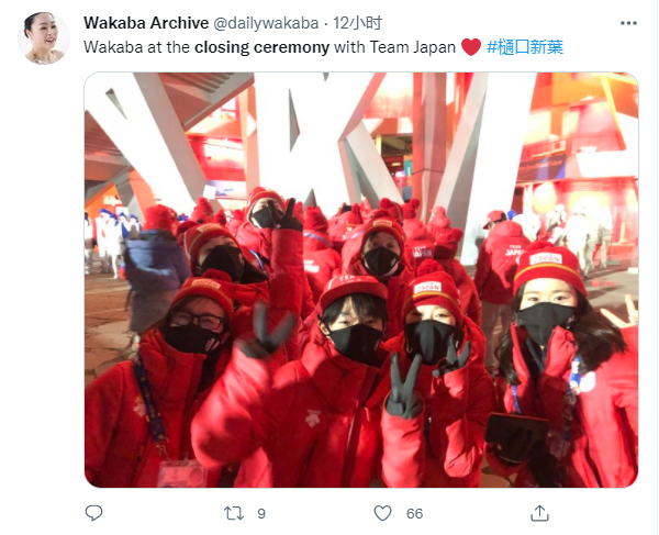 譯文:Wakaba與日本隊一起在閉幕式上。(圖片來源:推特)