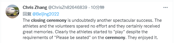 “閉幕式把我看哭了,給所有運動員們大大的祝賀!”“我們在頒獎儀式后被感動了!”“無與倫比,令人驚嘆!”……2022年北京冬奧會在經典旋律《友誼地久天長》中落幕,海外友人被閉幕式深深打動,海外社交媒體平臺也被全世界網友的驚嘆聲刷屏。
