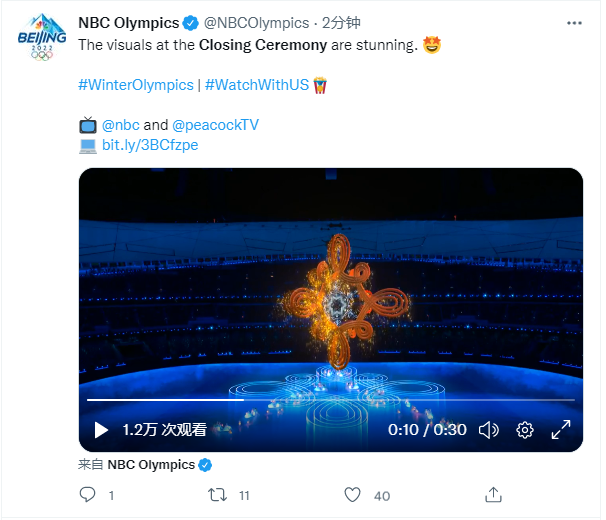 除了海外網友,北京冬奧會閉幕式更是全世界媒體關注冬奧會的焦點之一,閉幕式過后,外媒的評論如潮水般出現:美國全國廣播公司為外國觀眾科普什么是“折柳寄情”;英國體育網站Insidethegames特別強調了巴赫主席在閉幕式上對團結與和平的呼吁;《紐約時報》稱“北京冬奧會以一場精心設計的閉幕式落下帷幕,它是一場持續了一個多小時的迷人光聲表演,其間點綴著煙花。這是一屆與眾不同的冬奧會,開閉幕式表演令人激動;俄羅斯“婦女”網稱“閉幕式上,在鳥巢打出的中國結象征著中國春節,寓意是給人們帶來幸!。