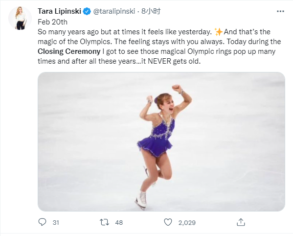譯文:多年過去了,但感覺起來就像昨天。這就是奧林匹克的魔力,你永遠有這種感覺。今天(2月20日),當我在閉幕式上看到那些曾多次出現的五環這么多年以后再次奇妙地出現……(我知道)奧林匹克讓人永遠年輕。(圖片來源:推特)