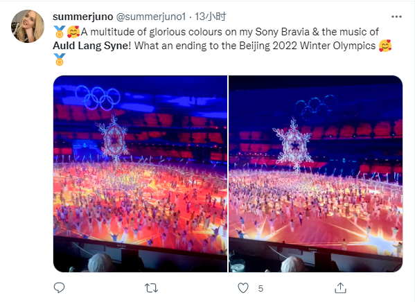 譯文:繽紛絢麗的色彩在音樂《友誼地久天長》和電視畫面中!北京2022冬奧會就這樣結束了!(圖片來源:推特)