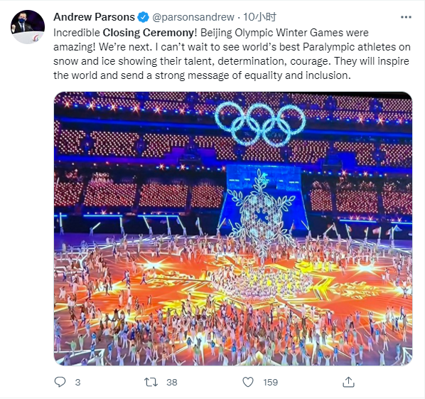 譯文:難以置信的閉幕式!北京冬奧會太棒了!接下來就是我們了。我迫不及待地想看世界上最棒的殘奧運動員在冰雪上展現他們的天賦、決心和勇氣。他們會激勵世界并傳遞強有力的關于平等和包容的信息。(圖片來源:推特)