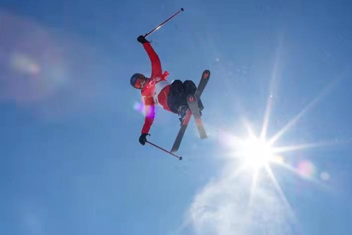 北京冬奧會期間,藍天白云下,正在參加比賽的運動員。