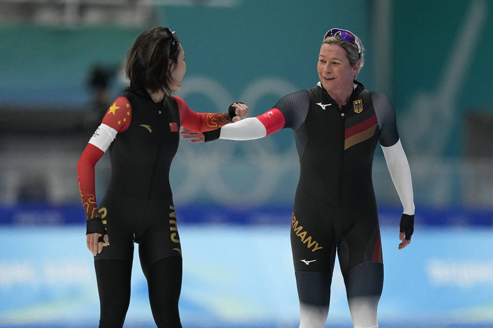比賽結束后,中國選手阿合娜爾向德國老將佩希施泰因表達敬意,佩希施泰因微笑著鼓勵阿合娜爾。