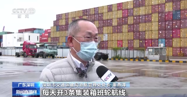深圳市交通運輸局港航管理處處長董燕澤:三個集裝箱港區計劃每天開三條集裝箱的航線,總體的話一天可以最少可以滿載360個集裝箱,來分流陸路的跨境運輸壓力。我們港口有能力來組織運力,保證深港的跨境運輸。
