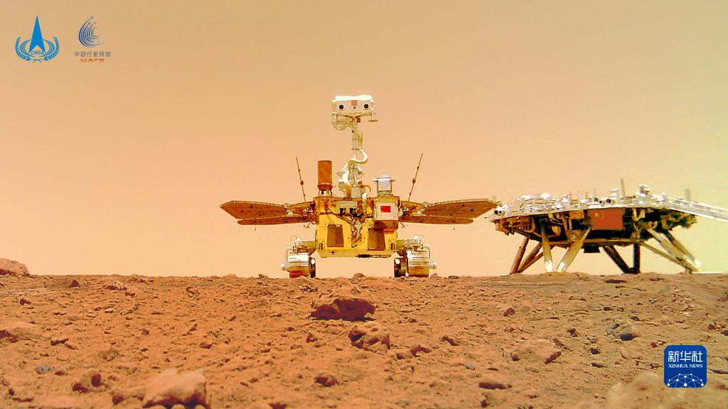 這是“著巡合影”圖。2021年6月11日,國家航天局在北京舉行天問一號探測器著陸火星首批科學影像圖揭幕儀式,公布了由祝融號火星車拍攝的著陸點全景、火星地形地貌、“中國印跡”和“著巡合影”等影像圖。首批科學影像圖的發布,標志著我國首次火星探測任務取得圓滿成功。新華社發(國家航天局供圖)