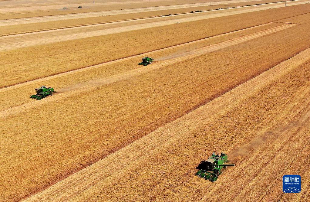 在河南省黃泛區農場九分場的麥田里,農機手操作收割機收獲小麥(無人機照片,2021年6月6日攝)。新華社記者 李安 攝