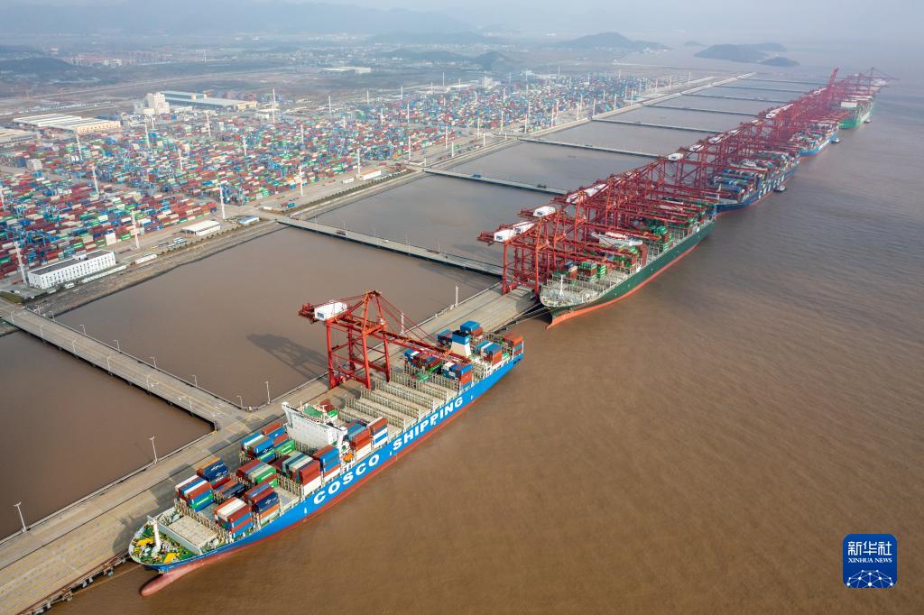 浙江寧波舟山港梅山港區集裝箱碼頭一派繁忙景象(2021年12月17日攝,無人機照片)。新華社發(蔣曉東 攝)