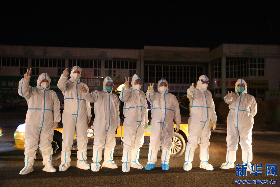 收工之前,現場部分志愿者司機們打出代表勝利的手勢,希望疫情早日散去,青城重現活力。新華網 李倩攝