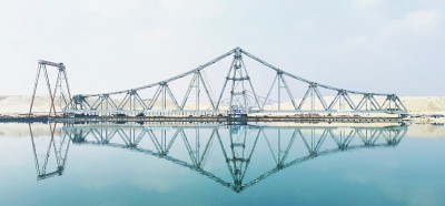 在埃及的中企把基礎設施“硬聯通”作為工作方向,持續推進多個“一帶一路”項目,取得突破性進展。圖為2021年11月16日,在埃及伊斯梅利亞省,由中企承建的蘇伊士運河新建法爾達內鐵路大橋進行轉橋對接測試。新華社發
