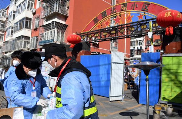 2月23日,在北京市海淀區北太平莊街道志強北園小區外,工作人員準備運送居民訂購的物品。新華社記者 任超 攝